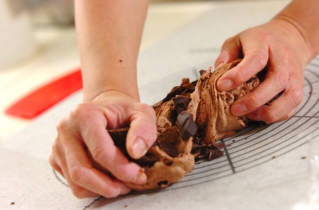 まんべんなくガスを抜き、生地を広げてスイートチョコレートを混ぜ込む。