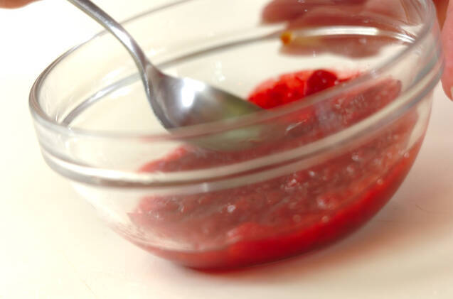 <梅肉ダレ>の梅干しは種を取り除き、ペースト状になるまで包丁で叩き、他の<梅肉ダレ>の材料と混ぜ合わせる。