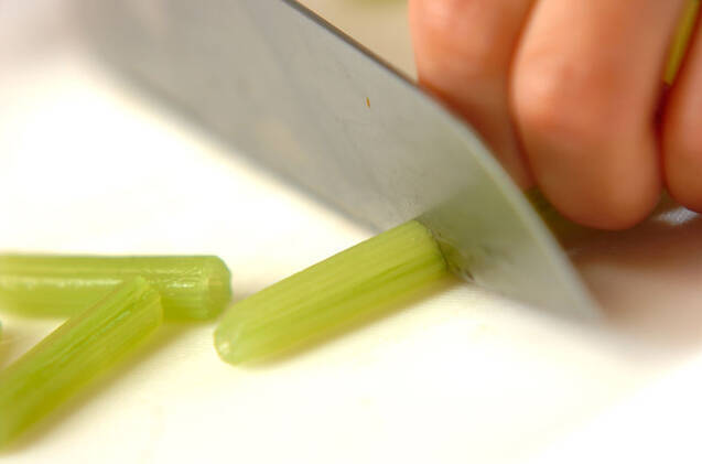 フキの粗熱が取れたら、切り口から皮をむき、長さ4cmに切る。太い場合は縦半分に切る。