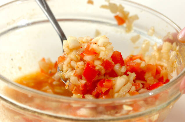 ボウルに玉ネギ、トマト、<調味料>の材料を混ぜ合わせる。