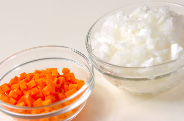 玉ネギはみじん切りに、ニンジンは皮をむいてみじん切りにする。