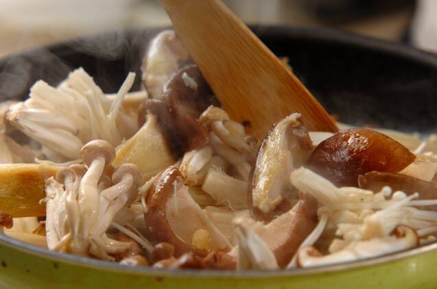 フライパンにオリーブ油を入れて中火にかけ、キノコ類、ニンニク、酒を加えてひと混ぜし、蓋をする。