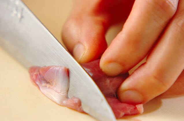 砂肝は白い部分を削ぎ落とし、2~3カ所切り込みを入れる。