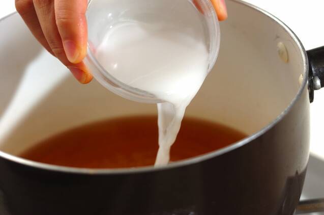 鍋に<あん>の材料を入れて中火にかけ、煮たったら<水溶き片栗>をまわし入れ、トロミをつける。