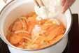 鍋にバターを中火で熱し、ニンジン、玉ネギを炒める。ニンジンがしんなりすれば米を加えて炒めあわせる。