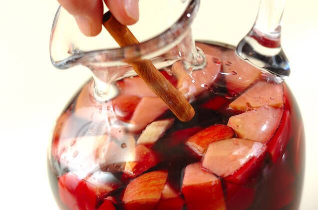 (1)に(2)、(3)、(4)とシナモンスティックを入れてよくかき混ぜ、冷蔵庫でよく冷やす。