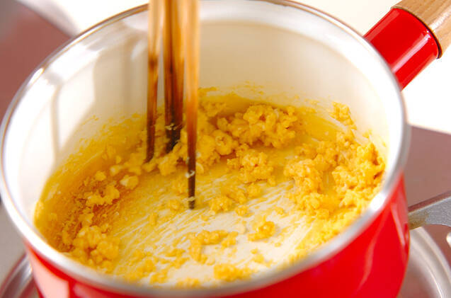 卵は割って溶き、<調味料>を加えて混ぜ、小鍋に入れる。弱めの中火にかけ、菜ばし3~4本で混ぜながら加熱する。鍋底が焦げないように、途中で鍋を火から外し、再び戻し、と調節しながら卵がポロポロになるまで加熱し、炒り卵にする。