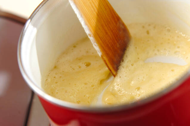 <みそソース>を作る。鍋にバターを弱めの中火で溶かして小麦粉を加え、粉っぽさがなくなるまで木ベラで混ぜながら炒める。