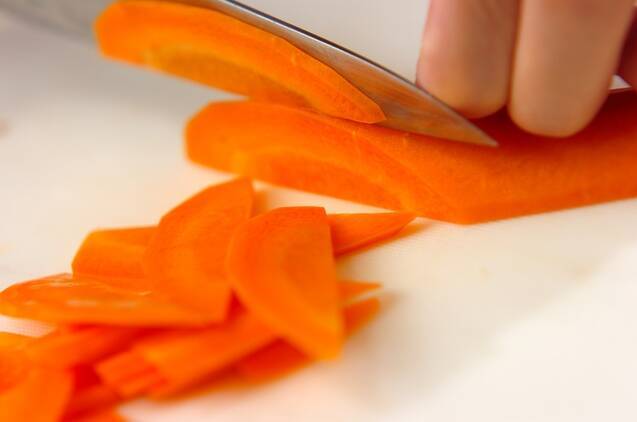 ニンジンは皮をむいて縦半分に切り、斜め薄切りにする。