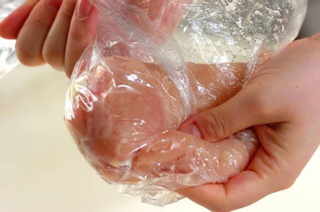鶏むね肉はビニール袋に入れ、<調味料>の材料を加えて手でよく揉み、30分ほど置いておく。