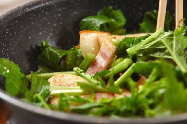 ベーコンとカブの葉を加えて強火で炒め合わせ、しんなりしてきたら塩コショウをし、器に盛る。