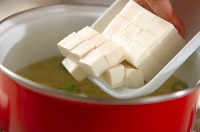 鍋にだし汁を入れて強火にかけ、煮立ったらオクラ、豆腐を加える。