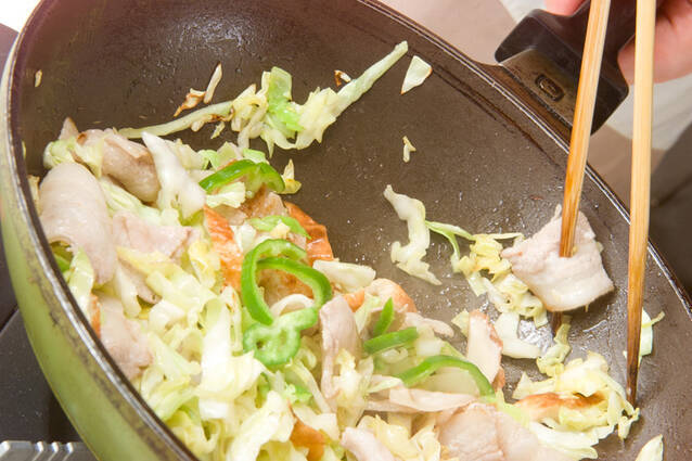 中華鍋にサラダ油大1を強火で熱し、豚バラ肉を炒め、キャベツを炒め合わせ、全体にザックリ炒められれば、ちくわ、ピーマンを炒め、いったん取り出す。