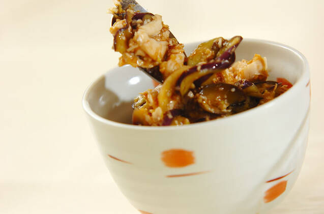 ボウルにナス、鶏ささ身、<タレ>を入れて混ぜ合わせ、ご飯をよそった丼にのせ、大葉を散らす。