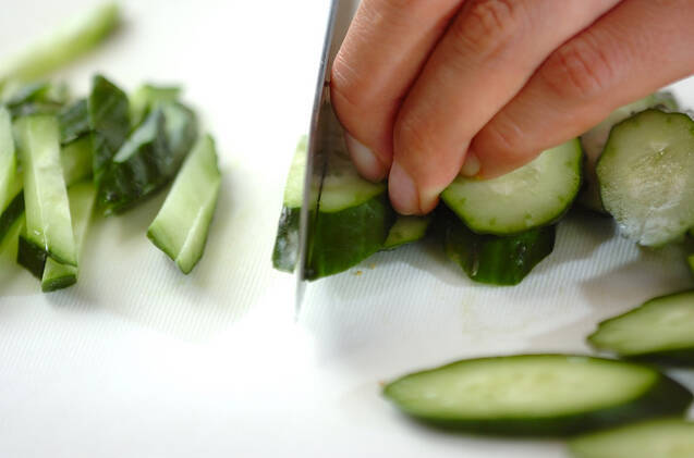キュウリは両端を切り落とし、斜め切りにしてさらに太めのせん切りにし、塩少々で軽くもむ。