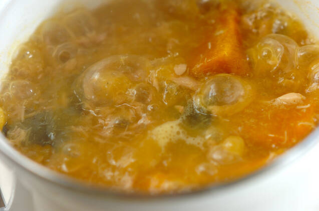 ササミと菜の花、カボチャのみそ豆乳シチュー