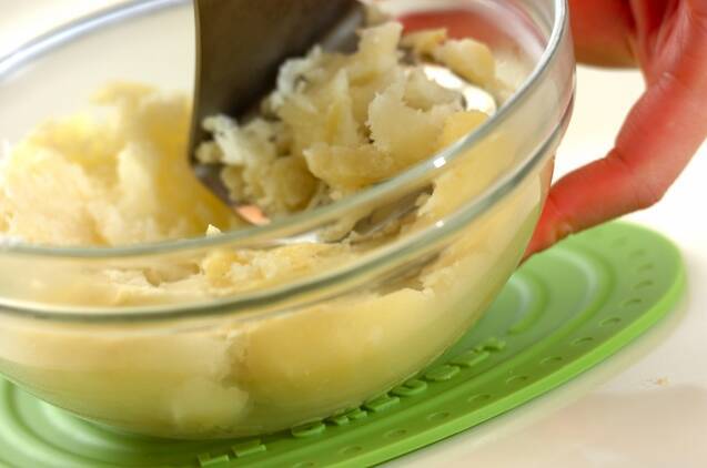 ジャガイモは皮ごときれいに水洗いし、ぬれたままラップに包んで電子レンジで3~4分、途中向きを変えて竹串がスッと刺さるまで加熱する。熱いうちに皮をむいてマッシャーでつぶす。