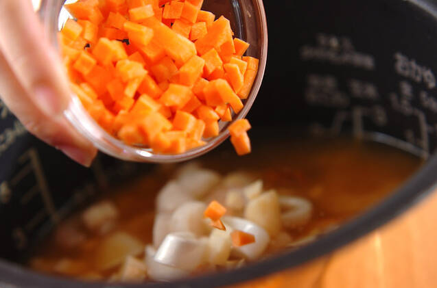 炊飯器にお米を入れ、<調味料>の材料、通常に炊く時の水量線までの分量外の水を加え、シーフード、水煮タケノコ、ニンジンを入れてスイッチを入れる。