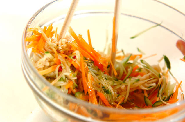 ボウルに<合わせショウガ酢>の材料を混ぜ合わせ、下準備した材料を加えて和え、10分以上置いて味をなじませ器に盛る。