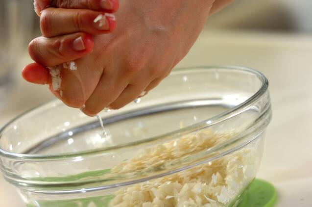 キャベツはみじん切りにして軽く塩でもみ、約10分位おく。水分が出たらしっかり水気を絞る。ニラも細かく切って軽く塩でもみ、水気が出たら絞る。