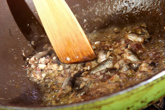フライパンにオイルサーディンを漬けオイルごと、オリーブ油、みじん切りにしたニンニクを入れて弱火にかけ、ニンニクの香りが立ってくれば、アンチョビを加える。