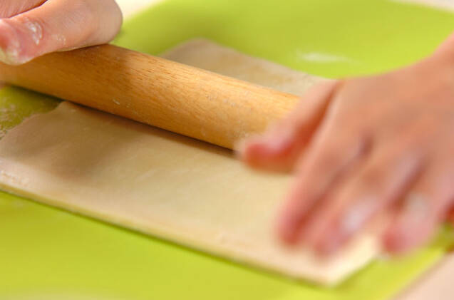 冷凍パイシートは、打ち粉をした平らな台に置く。半分に切り、倍くらいの大きさに麺棒でのばす。