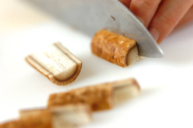 ゴボウは皮をこそげてすりこ木で軽くたたき、長さ4cmに切って縦2~4等分に切る。