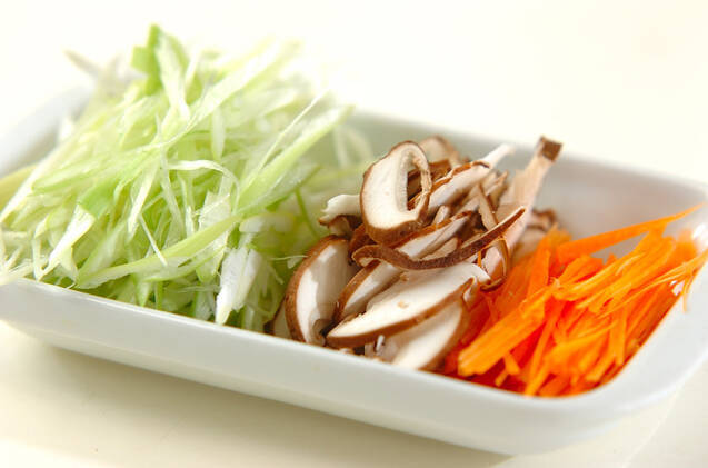 <野菜あん>のニンジンは皮をむき、せん切りにする。白ネギは縦半分に切り、さらに斜め切りにする。シイタケは汚れを拭き取り、石づきを切り落として軸と笠に切り分け、軸は細切りに、笠は薄切りにする。