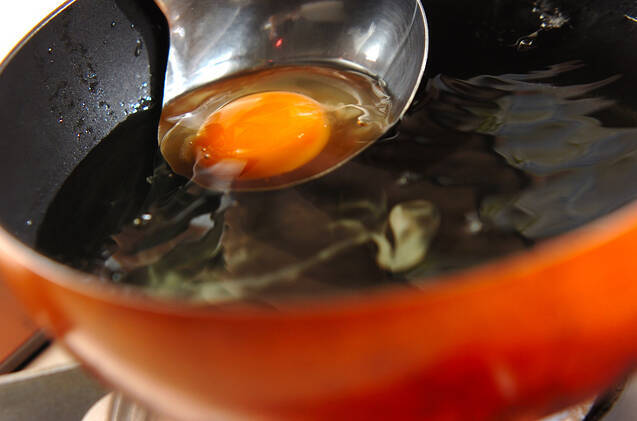 揚げ卵を作る。卵は1個ずつ器に割る。フライパンに揚げ油を入れ、160~170℃に予熱する。お玉を揚げ油に通して表面に油の膜を作り、割った卵をのせて火を止め、そっと揚げ油に入れて余熱で揚げる。