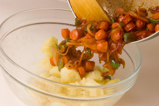 ソーセージは輪切りに、玉ネギは薄切りに、ピーマンはヘタと種を取りソーセージに合わせて切る。フライパンにサラダ油小2、ニンニク薄切りを入れて強火で熱し、ソーセージ、玉ネギ、ピーマンを炒め合わせ、<調味料>を加えからめるように炒めあわせ、1のジャガイモに加え混ぜ合わせる。