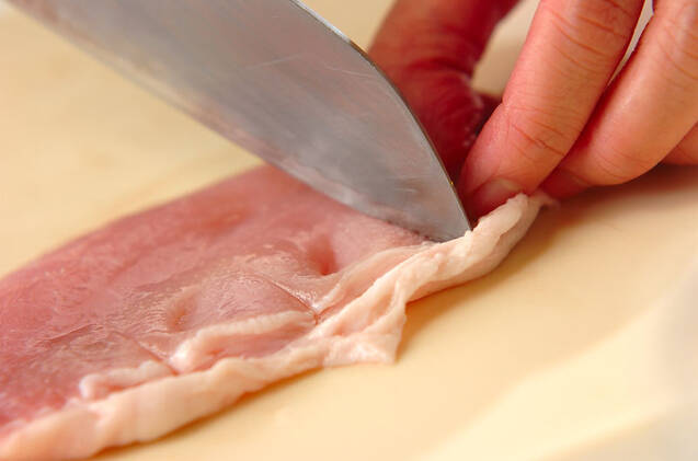 豚ロース肉の脂身と赤身の間にある筋を包丁の先で3~4カ所切る。