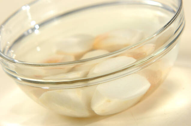 里芋は皮をむいてひとくち大に切り、水にさらして水気をきる。