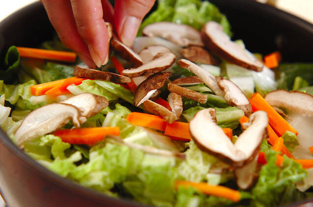 鍋に白菜と小松菜を敷き詰め、シイタケ、ニンジンを散らす。