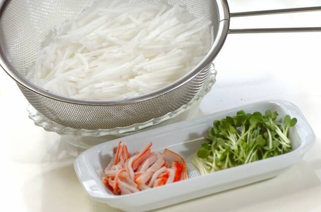 カニ風味カマボコはほぐす。貝われ菜は根元を切り落とし、長さを半分に切る。