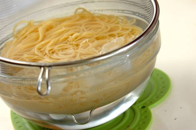 たっぷりの熱湯に塩を入れ、スパゲティーを袋の指定時間より30秒長めにゆでる。ザルに上げて冷水で冷やし、水気をきる。