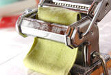 ローラーの間隔を狭くしながら、生地が少しずつ薄くなるようにピッチダイヤルを調整しながらローラーに通す。お好みの厚さになったら、同じ目盛りで2~3回ローラーを通し、生地の縮を押さえる。ここでは、ピッチナンバー4、少しコシのある厚みです。