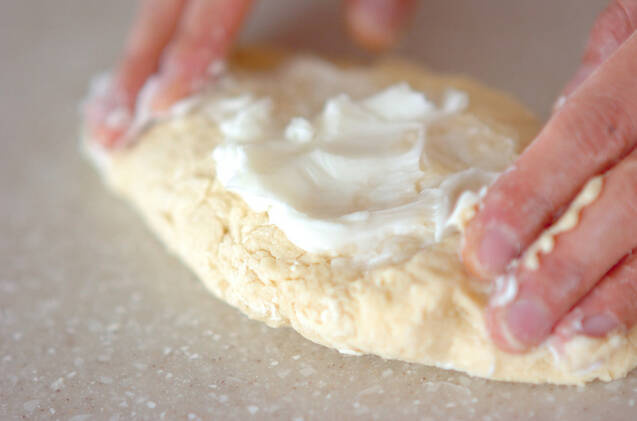 ショートニングを生地に混ぜ込み、10分ほどなめらかになるまでこねる。