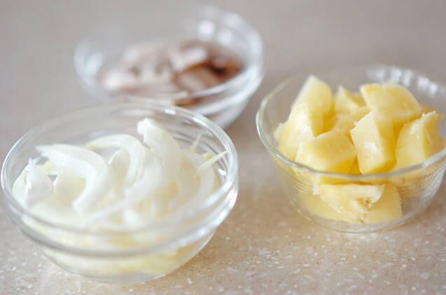 <フィリング>を作る。ジャガイモは皮のままラップで包み、火が通るまで電子レンジで加熱し、熱いうちに皮をむいて小さめのひとくち大に切る。玉ネギは薄切り、ベーコンは幅2cmに切る。電子レンジは600Wを使用しています。