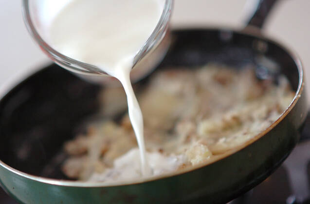 フライパンにバターを熱し、玉ネギを炒める。ベーコンを加えてよく炒めたら、薄力粉を加えて粉気がなくなるまで混ぜ合わせる。牛乳を少しずつ加えて溶きのばし、全体に火が通ったら、ジャガイモを加え、塩コショウで味を調え、冷ましておく。