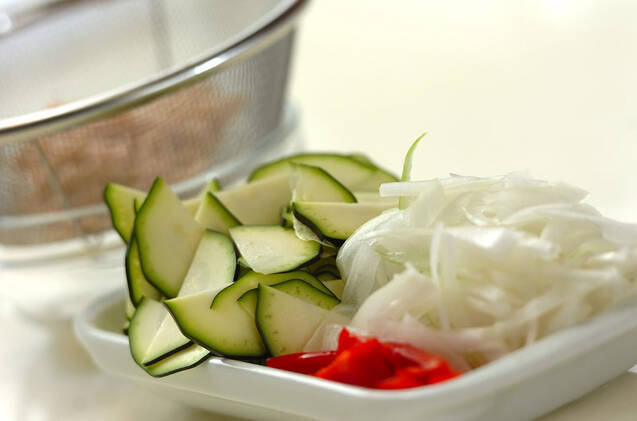 ズッキーニは薄い半月切りにする。玉ネギは半分にしてから薄切りにし、水にさらして水気をきる。赤パプリカも薄切りにする。ツナは油をきる。