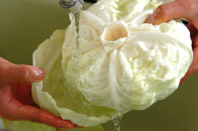 キャベツは芯をくりぬき、くり抜いた部分を流水に当てながら水圧で1枚ずつそっとはがす。たっぷりの熱湯でゆで、冷めたら軸のかたい部分を削ぎ切り、細かく刻む。