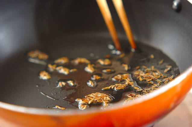 フライパンにサラダ油、クミンシードを入れて中火にかける。クミンシードの香りがたってきたらベーコンを加えて炒め合わせる。