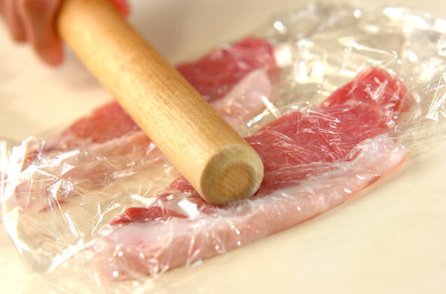 豚肉はラップではさんで、すりこ木または肉たたきで厚さが5mm位になるまでたたいてのばし、塩コショウをする。<衣>の小麦粉、<チーズ卵液>、パン粉をつける。
