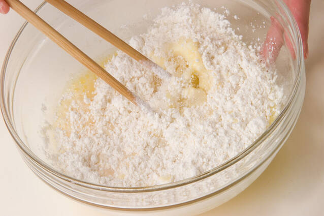 <衣>をあわせる。ボウルに卵と冷水を混ぜ合わせ、小麦粉を加え軽く混ぜる。混ぜ過ぎるとサクッと揚がりません。
