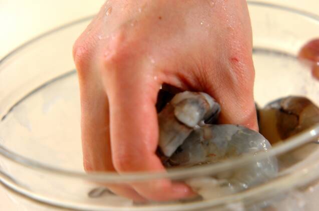 エビは殻をむき、背ワタを取ってボウルに入れる。<臭み抜き>の材料を加えてもみ洗いし、水洗いして水気を拭き、塩コショウをする。