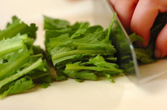 春菊はきれいに水洗いし、長さ3~4cmに切る。ニンジンは皮をむき、細切りにする。