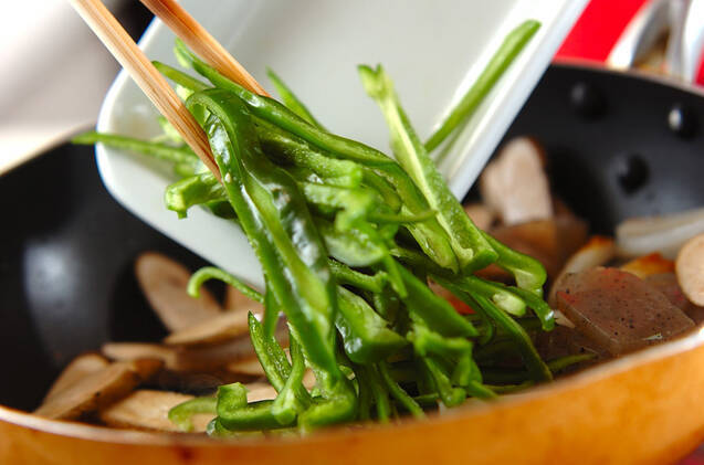 フライパンにゴマ油を強火で熱し、ゴボウ、ちくわを炒め、板コンニャク、ピーマンも炒め合わせる。
