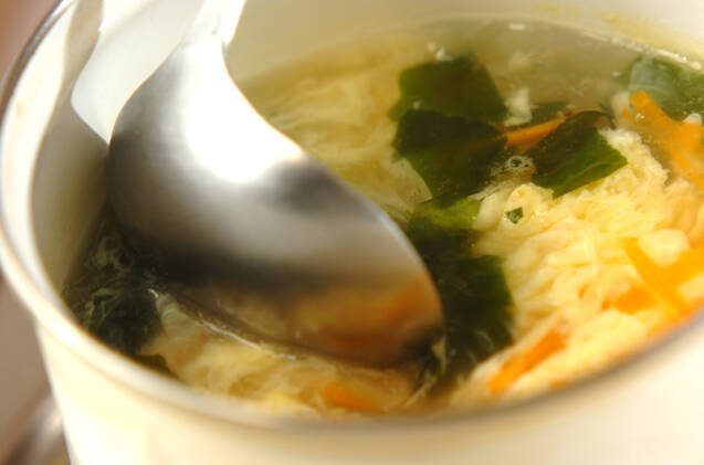 溶き卵を加え、ふんわり浮かんできたらひと混ぜして器に注ぎ、白ゴマを散らす。