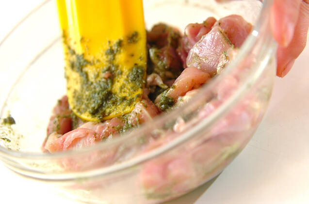 鶏もも肉は小さめのひとくち大に切り、バジルペーストをからめる。