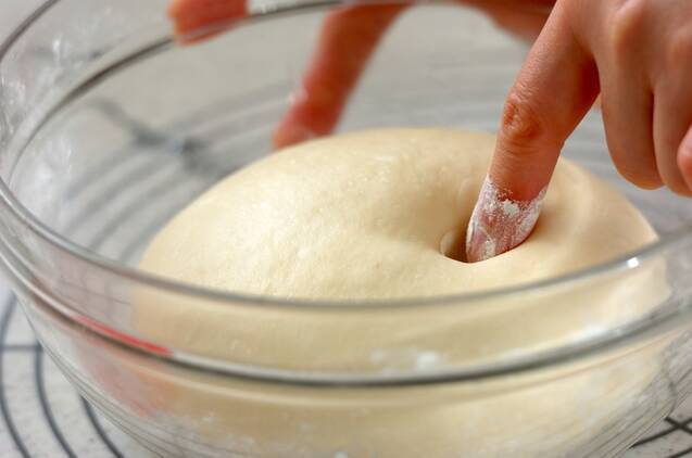 【一次発酵後】生地が2倍程度大きくなっていたら、分量外の強力粉を指につけて(3)の生地にフィンガーテストをする。